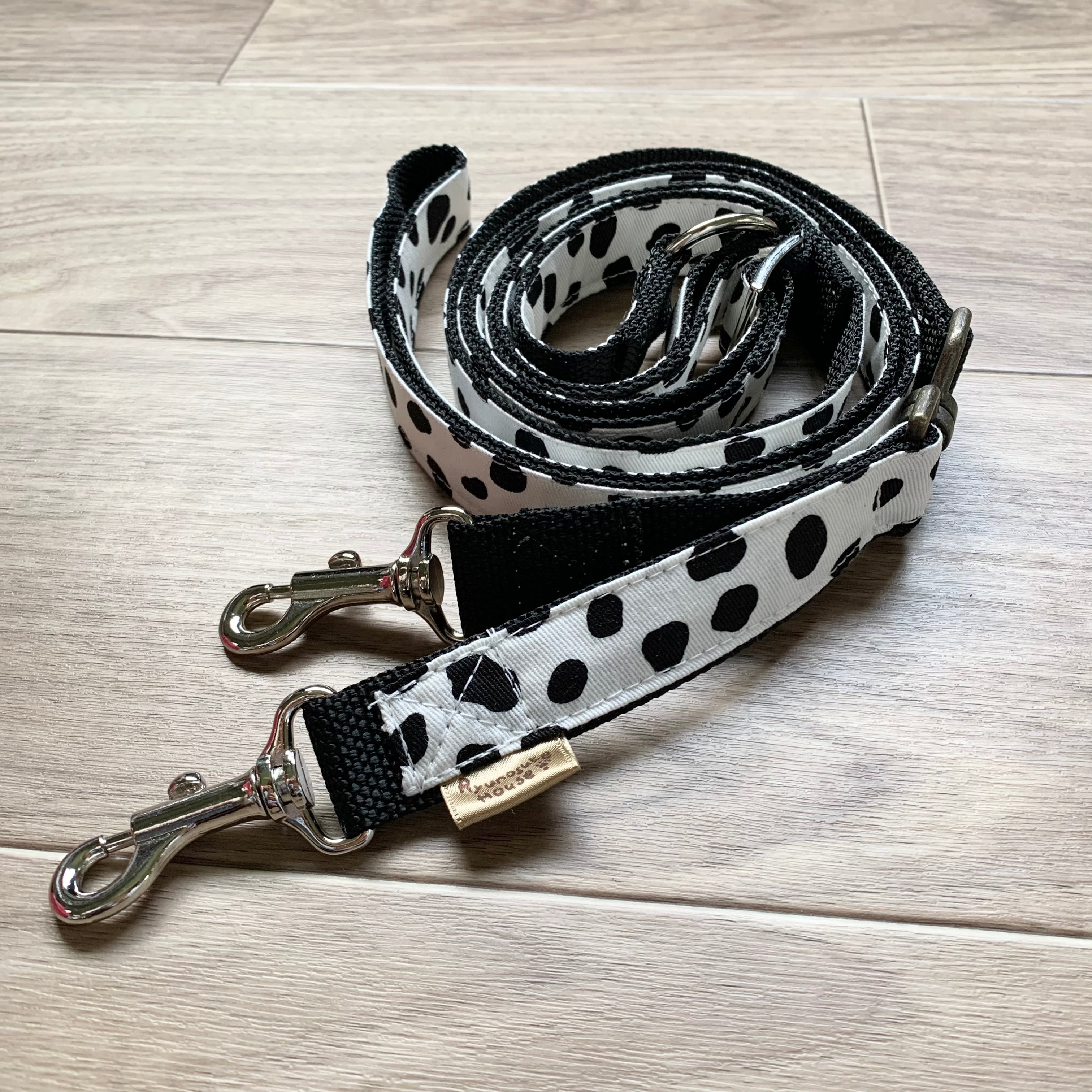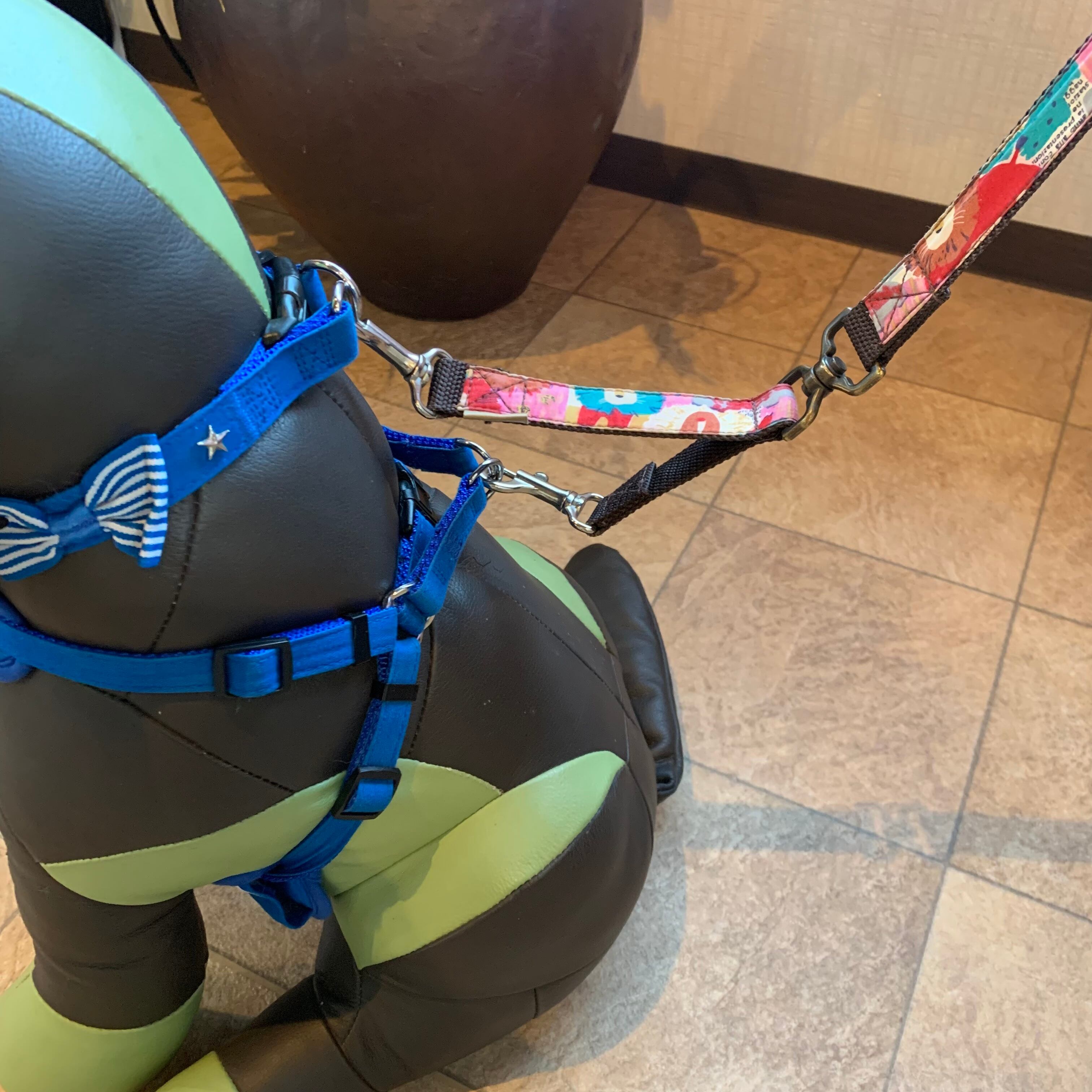 先が二股になっているので、短い方をハーネス、長い方を首輪 ( ハーネス無しでダブル首輪の場合は首輪に ) 付けてご利用ください。