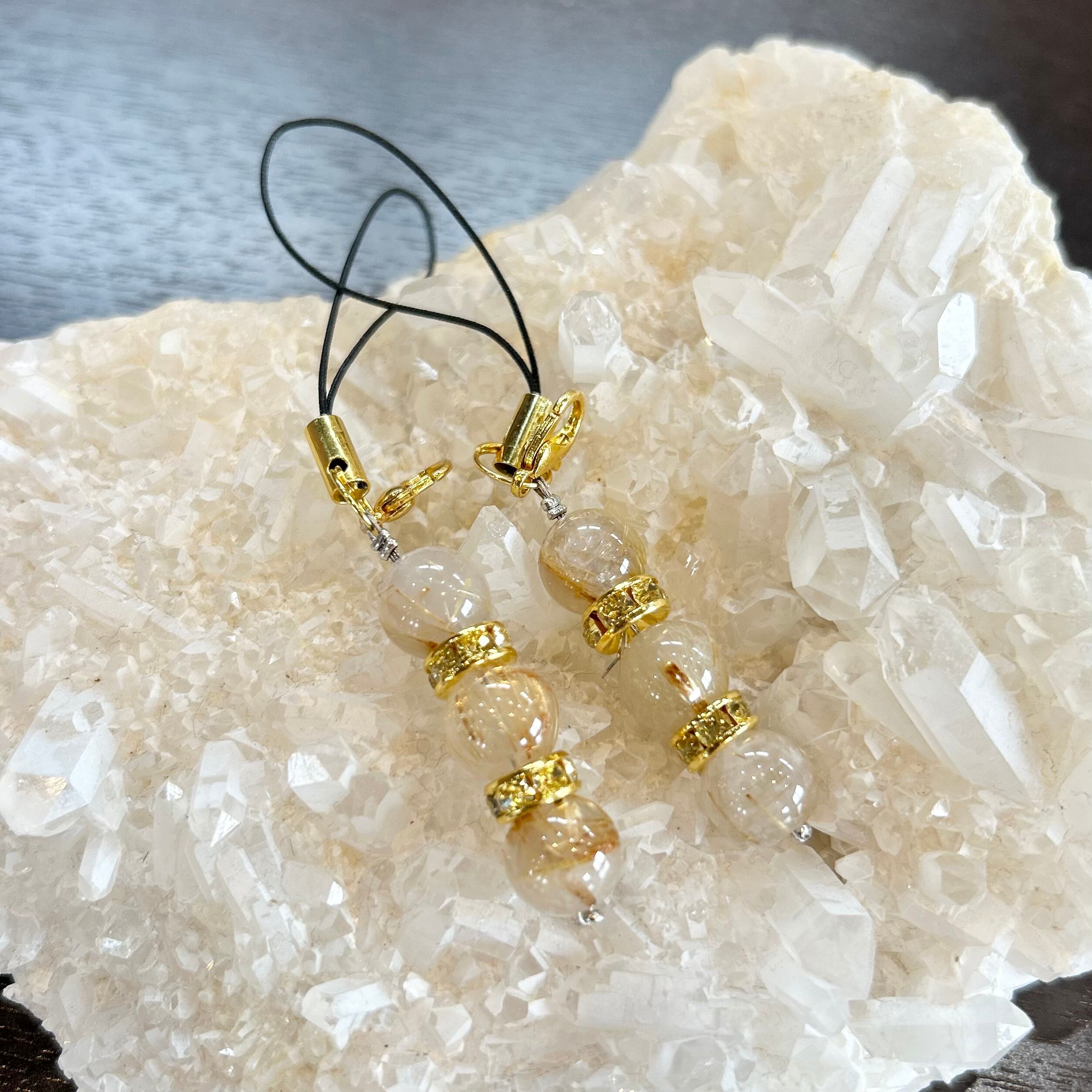 あらゆる障害物を取り除き、物事を発展させると言われているルチルクォーツでお作りしたストラップです。