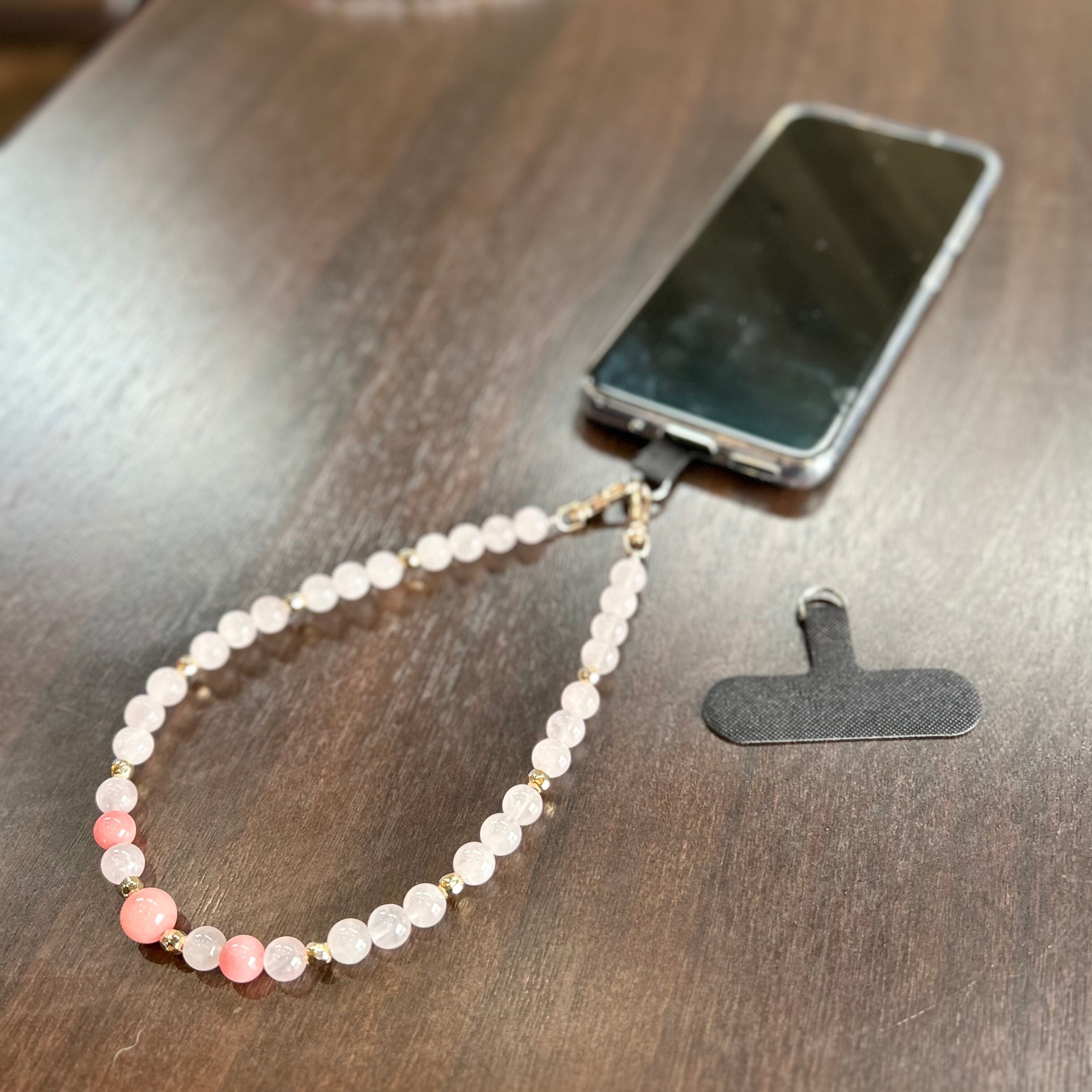 周囲と争わず、穏やかに冷静に物事を解決する洞察力を身につけるきっかけを与えてくれるというピーチジェードでお作りしたハンドストラップです。