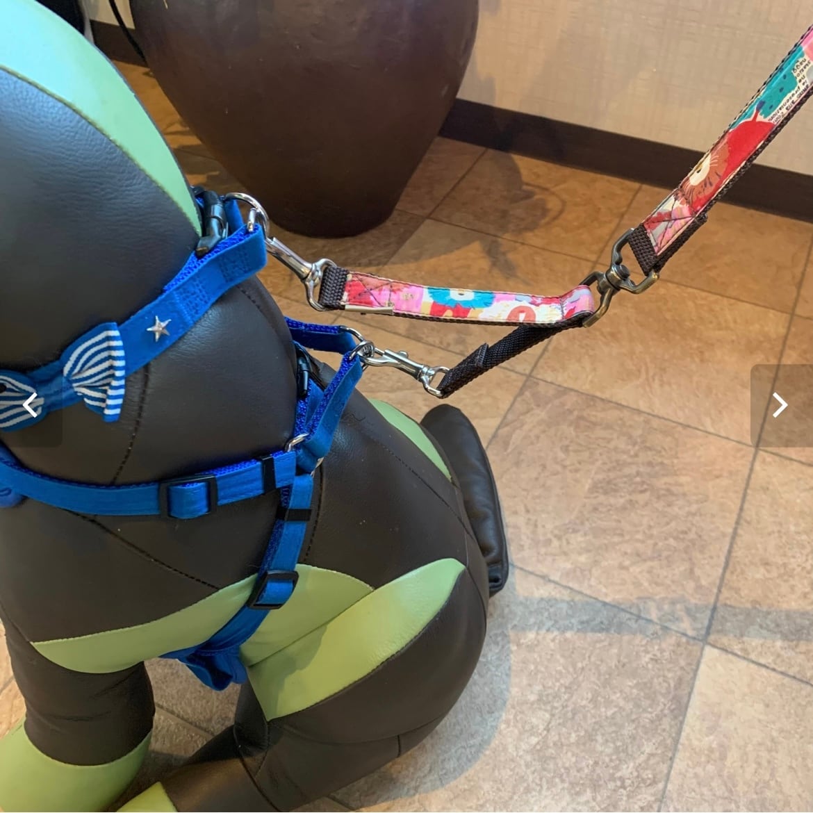 先が二股になっているので、短い方をハーネス、長い方を首輪 ( ハーネス無しでダブル首輪の場合は首輪に ) 付けてご利用ください。